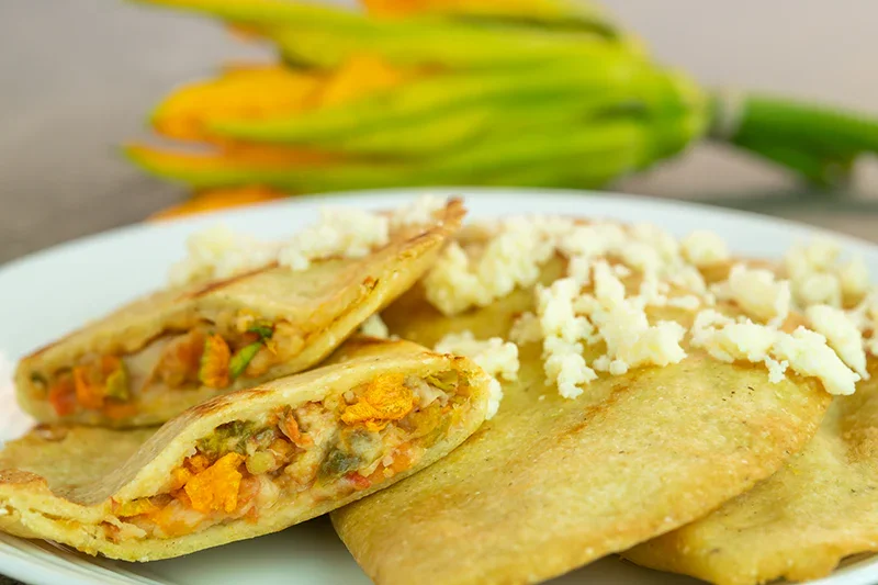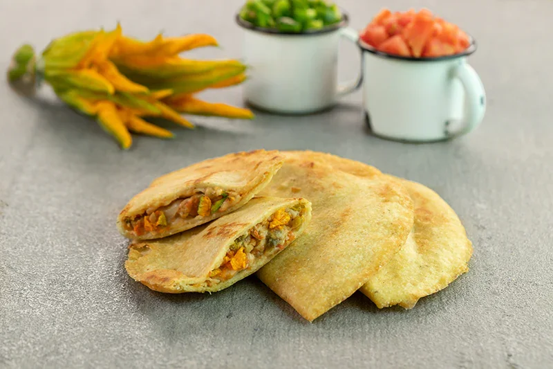 Quesadillas fritas y hechas a mano, listas para disfrutar en cualquier momento. Cada bocado combina queso fundido, flor de calabaza, jitomate, cebolla y chile, creando una mezcla de sabores irresistible y reconfortante.